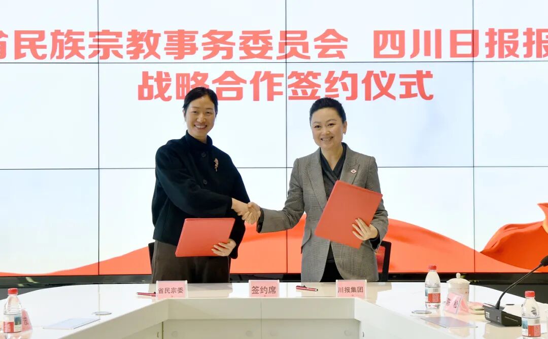 仪式上,宋秋与谭江琦作为双方代表签署《四川省民族宗教事务委员会 四川日报报业集团战略合作协议》。双方将遵循“资源共享、优势互补、合作共赢、共同发展”的原则,通过构建全方位、多层次、宽领域的合作格局,大力宣介中华民族共同体意识,讲好四川民族宗教故事,为推进中华民族共同体建设凝心聚力,更好地服务省委“四化同步、城乡融合、五区共兴”发展战略。按照协议,双方将发挥资源、人才等优势,在四川民族宗教工作的宣传阵地建设、文化品牌打造、重点课题研究等5个方面12项具体事项全面深化合作,涵盖重大主题宣传、专属频道建设、品牌活动培育、行业智库共建、人才培养交流等多个领域。