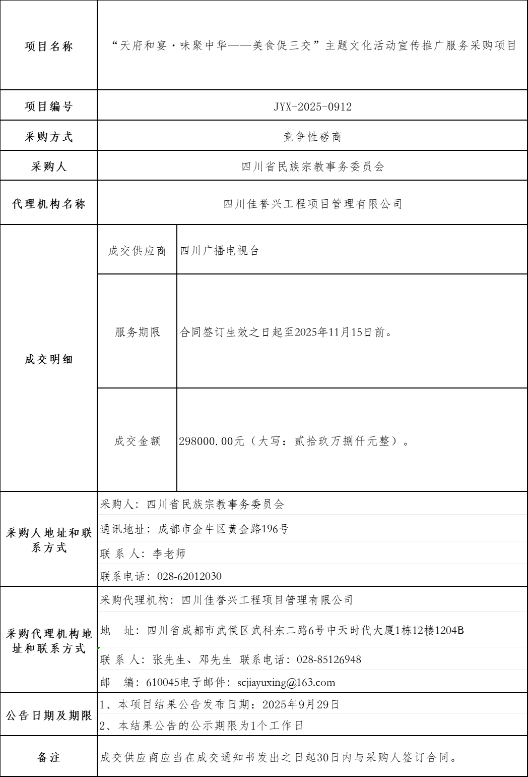 “天府和宴・味聚中华——美食促三交”主题文化活动宣传推广服务采购项目成交结果公告