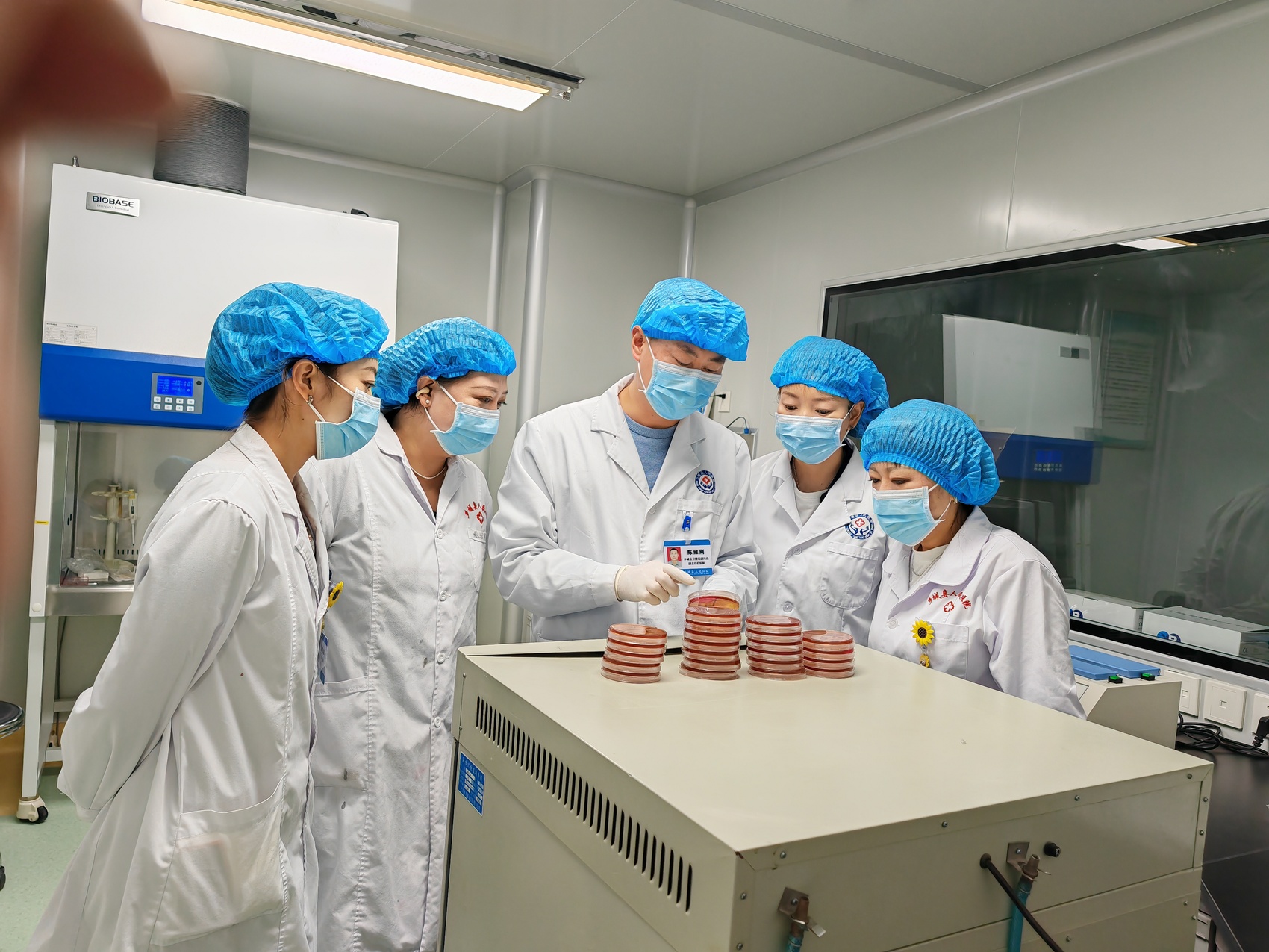 陈维刚(左三)在乡城县人民医院检验科开展沙门菌、志贺菌培养鉴定操作示教