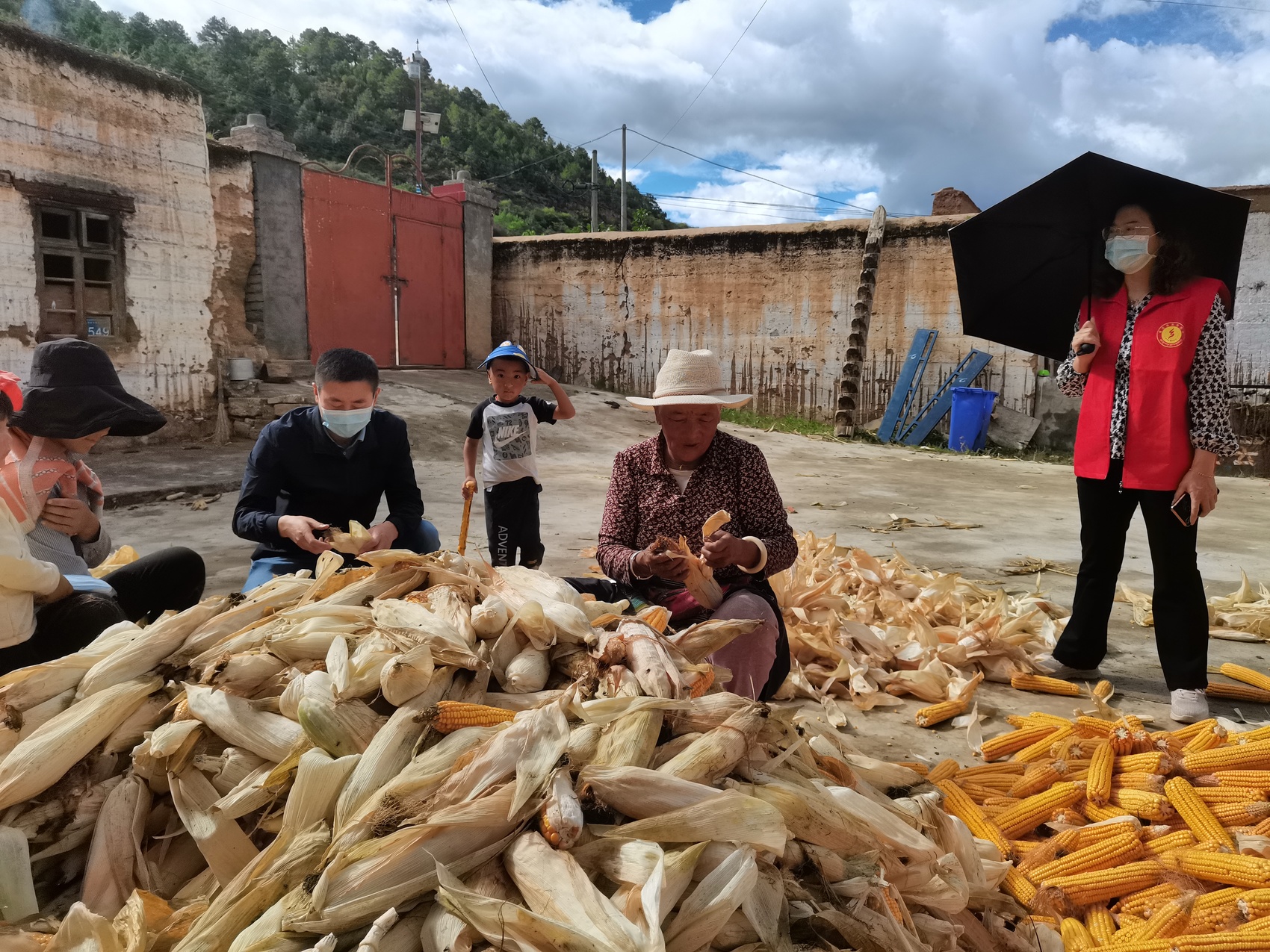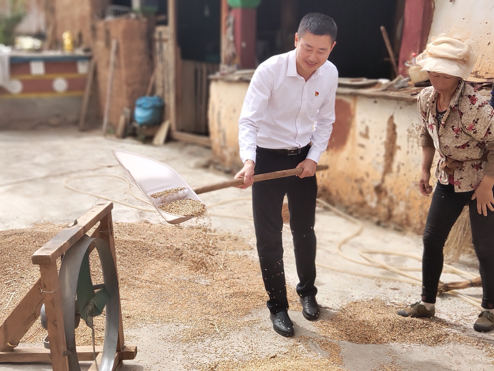 陈维刚在藏亲洛绒翁堆家帮忙翻晒青稞